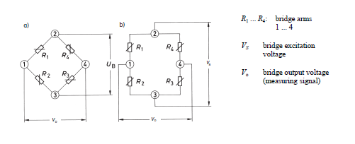 后一种方法用于应变技术。它可以测定应变片电阻的相对变化,通常精度可达 10-4 到 10-2 Ω/Ω。 下面的图片显示了惠斯通电桥的两个不同的电气连接图,它们是完全相同的:图a)显示了通常使用惠斯登电桥的菱形连接;和图b)是相同电路,这对于未经过电气训练的人来说,这将更清楚。 惠斯通电桥的四个桥臂或分支由电阻R1至R4组成。桥的角点2和3指示桥路激励电压Vs的连接;角点1和4为电桥输出电压V0即测量信号。 The bridge excitation is usually an applied, stabilized direct, or alternating voltage Vs